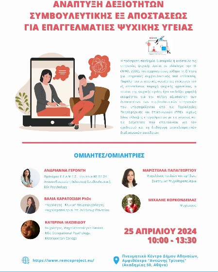 During the event, the REMCO project results and educational material were presented, while there were interesting discussions and speeches by experts in the field (psychologists, psychotherapists and psychiatrists), about the practices surrounding remote councelling services, the challenges faced by the professionals who conduct sessions remotely, ethical issues raised and the importance of therapists' self-care.